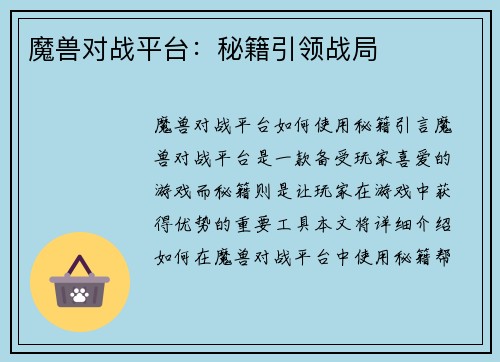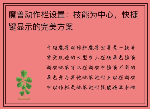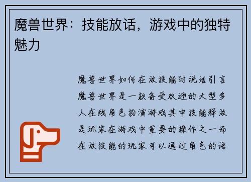 魔兽如何拖技能 一、技能拖延的定义和意义 技能拖延是指在魔兽游戏中,玩家故意延迟使用某些技能,以达到更优化的战斗效果。技能拖延的意义在于提高输出效率、增加生存能力和更好地控制战局。下面将从几个方面介绍魔兽如何拖技能。 二、技能拖延的基本原则 技能拖延的基本原则包括选择合适的技能拖延对象、合理规划技能使用顺序、根据战斗情况选择拖延技能的时机等。通过合理运用这些原则,可以最大限度地提高技能的使用效果。...